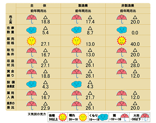 | 繊維工業 | 織物製成人男性・少年服製造業 *全体的に受注の状況は良くない。また、人手不足のため、納期対応が難しい。 |
