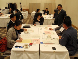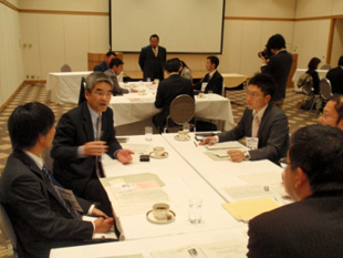 その後、アンケート調査結果の報告を挟みグループディスカッションを行い、コーディネーター役に経営戦略塾“タケシタ”の竹下幸也先生の指導の下、参加者の“夢”を語る形で5人ずつ5グループに分かれて討議を行いました。